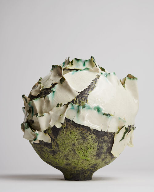 Jane Yang-D’Haene’s handcrafted stoneware vessels are often inspired by the dal hangari, or traditional Korean moon jar. Her exhibition “In Memory of Memory” at Mindy Solomon Gallery pushes beyond the boundaries of the traditional ceramic technique. Departing from the smooth white exteriors usually seen on moon jars, her work features frenetic paintings, reptilian ornamentations, and intentionally distorted exteriors, as seen in works like Untitled XIII (2024), a green-glazed vessel that has collapsed in from the top.