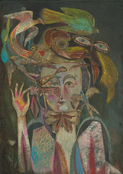Olaf Hajek’s inaugural solo exhibition in China, “The Marriage of Flowers in the Mirror,” takes its title from the 1827 fantasy romance novel by Chinese author Li Ruzhen, which is set in an idealized world where women lead and gender roles are subverted. This allegory provides an evocative backdrop for Hajek’s 30 works on wood panels. In each kaleidoscopic piece—such as Wirres Gefühl (2023), a portrait of a woman swarmed by birds and butterflies—Hajek crafts a visual narrative that places its subjects amid a fantastical rendering of nature.