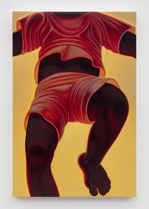 Telling the truth, of course, means portraying the negative as well as the positive. Leveraged (Living In The Red) (2024), for example, depicts two headless figures, an adult and a child in coral and white clothing, seemingly suspended and falling backward in a state of serene embrace. However, as Gardner sees it, this pair is in a state of “free fall,” acknowledging the “sense of precarity” in everyday life, a nod to the unpredictability of human existence. It’s a depiction of his own experiences. “The thing about getting older is you just realize how little time you actually have,” said Gardner. “I still want to incorporate some discomfort and an acknowledgment of suffering because that’s inevitable and unavoidable.”