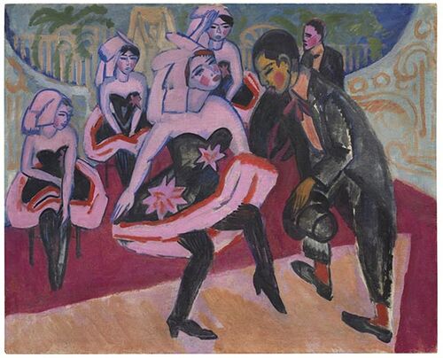 The 4-by-5-foot painting dates to the period in which Kirchner was a leader of Die Brücke, a group of artists closely associated with German Expressionism. It features a Black man dancing with a white woman at a party—a scene of modern life captured in vivid colors and highly stylized figures.. The work was last exhibited in 1923 at Kunstsalon Paul Cassirer in Berlin.