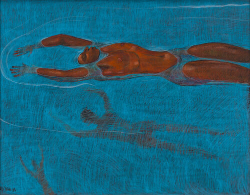The influence is apparent when the brothers’ paintings are placed in direct conversation. Boscoe’s and Geoffrey’s works share an emotive, luscious use of color, their portraits of Black subjects popping against expressive fields of color in bright reds, yellows, blues, and greens. The impact of their respective dance careers is felt in their depictions of lithe bodies in effortlessly graceful postures. Both painters frequently captured their subjects nude, posed in moments of contemplation or leisure—as in Geoffrey’s Swimmers II (1986) and Boscoe’s Fret Work (1988), both on view at Victoria Miro.