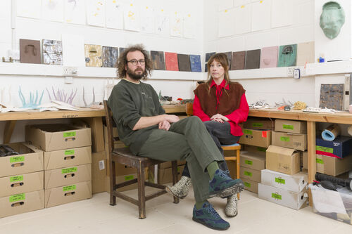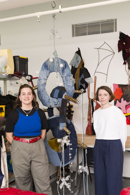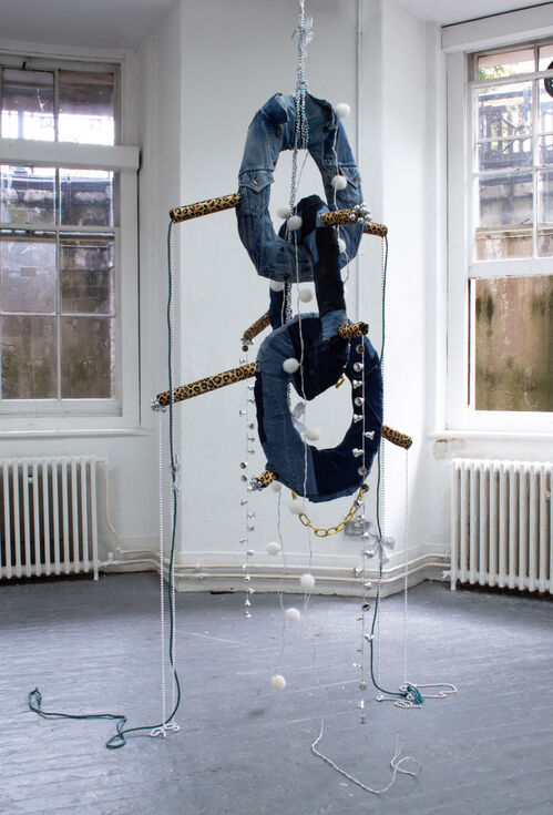 Slade MFA student Bella Bradford’s fabric sculptures feel both familiar and alien at the same time. Her humorous, varied steel armatures are upholstered with found, donated, or secondhand materials. “Societal habits towards materials, clothing, and trends fascinate me,” Bradford said, noting the prevalence of movements like normcore or cottagecore. “I’ve more recently become interested in fashion ‘cores,’ how they’re replaying history, and spreading through social media,” said Bradford.