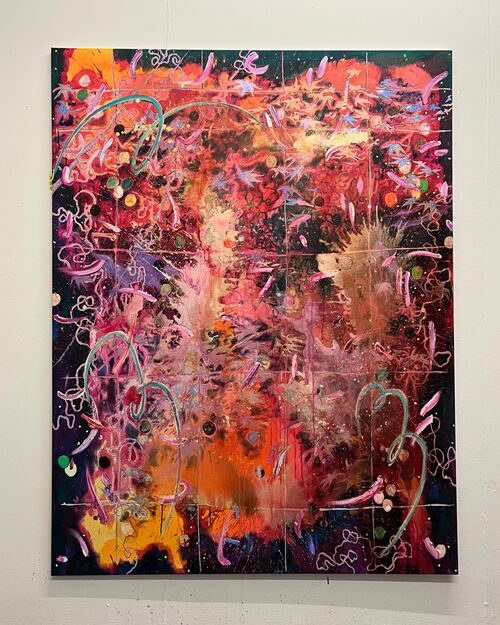 Aethan Wills’s expressive oil paintings are primarily inspired by the artist’s upbringing in Japan and the U.K. Explosions of color trip and spin across the canvas, depicting fragmented visions of lakes, plum trees, and sunsets.