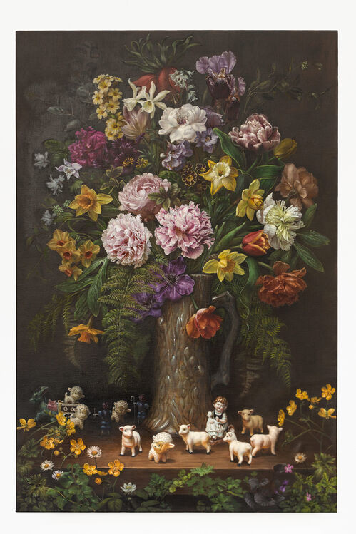 Using homegrown bouquets of flowers as an allegorical backdrop, painter Angela Lizon appropriates the visual language of 17th-century Dutch painting, adding kitsch objects, vegetables, and amusing porcelain figurines to her compositions.