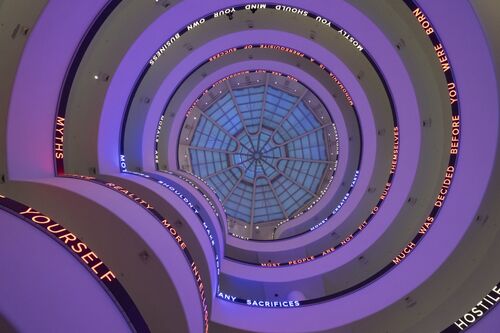 While the centerpiece of “Light Line” brilliantly activates the full ramp, the museum bays remain mostly bare, recalling the blacked-off lines of her “Redaction Paintings.” And yet beyond the obvious spiraling path, such as stairwells or other less-conspicuous corners, there is additional artwork—including recent watercolors based on the heavily redacted reports and documents about Russian influence in the 2016 U.S. presidential election. Once again, Holzer surprises by subverting traditional presentational procedures of museums and institutions, discreetly reminding us, even when her own blazing light show pulls at our attention, to look closely and question intentionally.