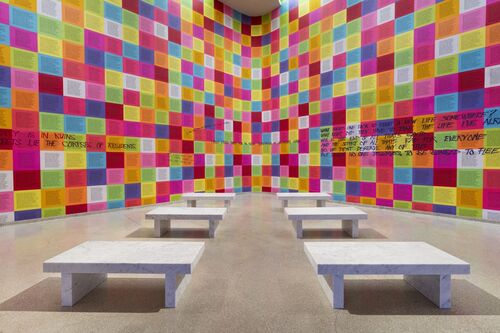 Holzer’s explorations of LED signs, which had a newfound capacity for displaying moving text, led to a project commissioned by the Public Art Fund for the Spectacolor board in Times Square in 1982. Recognizing the potential of these signs to create immersive and site-specific experiences (as opposed to traditional paper posters, which have activist, DIY associations), she continued to use them to lend her words a sense of impartial authority. Her 1989 installation at the Guggenheim Museum transformed half of the iconic spiraling rotunda into an electronic arcade. “Light Line” restages this installation, expanded to encompass the entire six-story spiral, and updated with flashing and strobing chromatic effects.