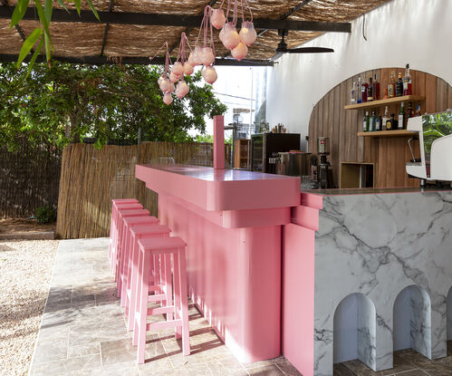 Situated on the more serene northern side of Ibiza, the fluorescent pink bar stools and breast-shaped chandeliers on the patio of Gathering’s new space, designed by British artist Tai Shani, is part of its on-site restaurant, named Mira after founder Alex Flick’s daughter, and is an apt calling card for the London-born gallery’s experimental approach to programming.