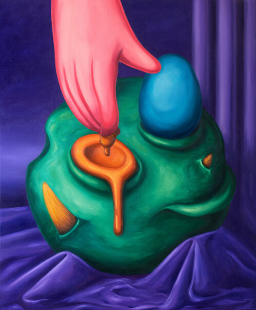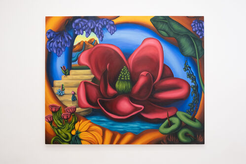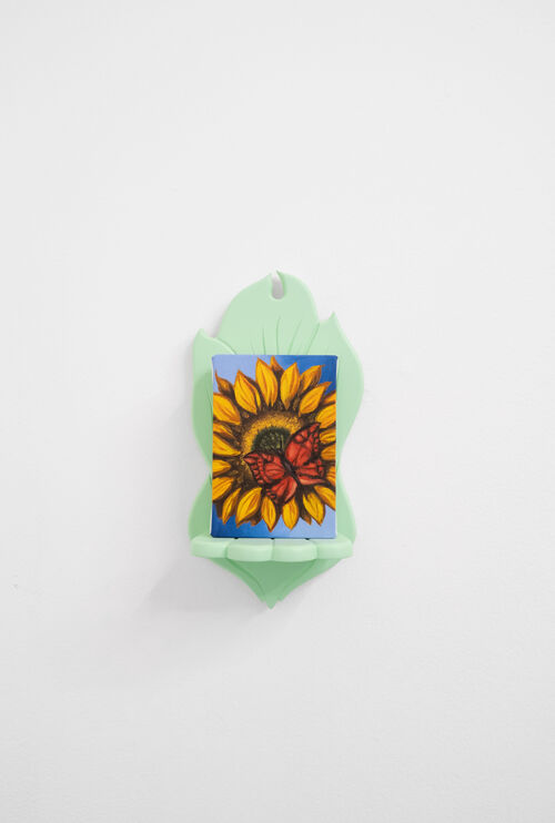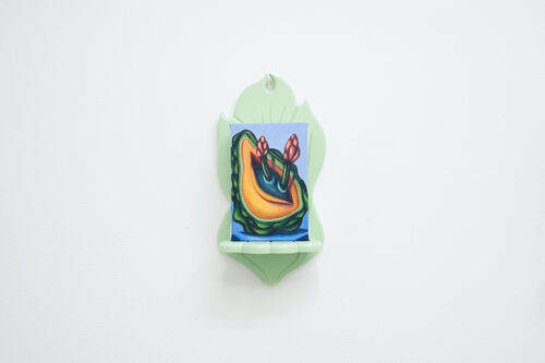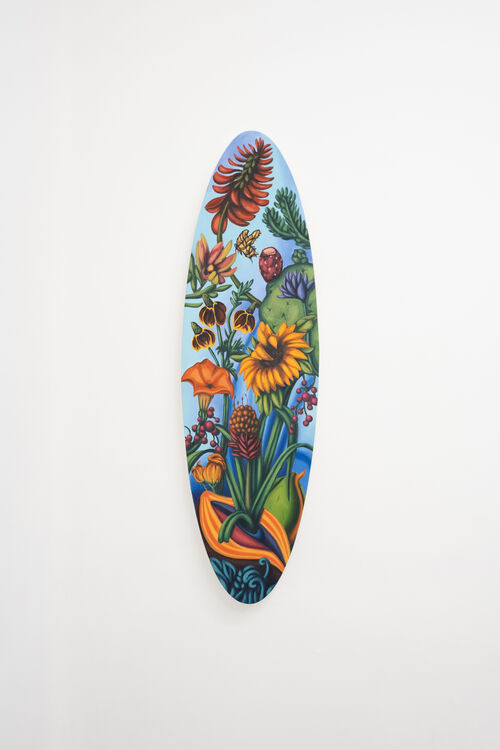 In her solo show “Ofrenda,” on view at DANIELA ELBAHARA in Mexico City through July 19th, the artist elevates these scenes in large works on canvas, some oval-shaped. Another series of smaller works are presented on mint green, leaf-shaped altar shelves, and turn the ritual of offering (the English translation of the exhibition’s title) into bright, contemporary evocations of the surreal elements of nature.