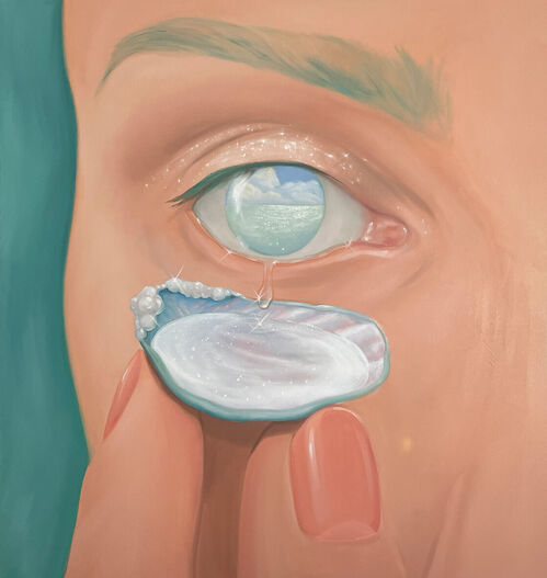 But despite their splendid environs, Marchewka’s female subjects seem unsettled, caught in surreal moments of transition or uncertainty. In Mirror (2023), for example, a blue-haired nude gazes at her reflection, only to find a cosmic void where her body should be. Marchewka’s women are often crying, tears adorning their faces like jewels.