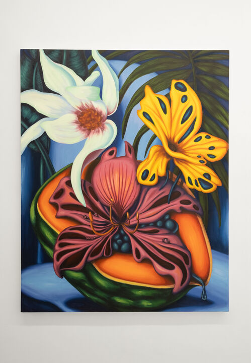Flowers bloom seductively throughout Spanish artist Kora Moya Rojo’s paintings. Portrayed in a bright color palette and an oozing, bulbous aesthetic, the artist’s blossoming subjects morph into strange shapes. Distorted petal configurations bend and twist across her paintings in oil and watercolor, which also feature fleshy tropical fruits.