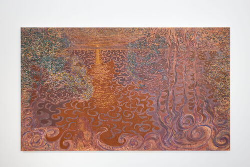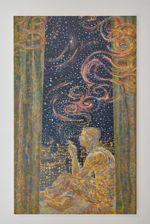 At Ronchini Gallery, the artist’s latest exhibition, “Mistaken Shores,” shows several hypnotic, fantastic landscapes, such as Hear, Said (2024), which depicts a psychedelic sunset over an ocean horizon rendered in luminous, swirling colors. This show transports the viewer into a starry world where the colors of natural or city scenes are illuminated and exaggerated, changing how we perceive these otherwise familiar landscapes. He often compares his paintings to language, an interpretation of the world around him. At Ronchini, building on this focus, Raz’s paintings are accompanied by a collection of poems written in response to the paintings in collaboration with poet Ben Ridley-Jones.
