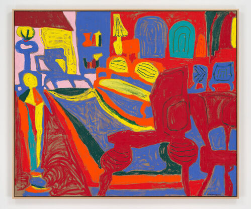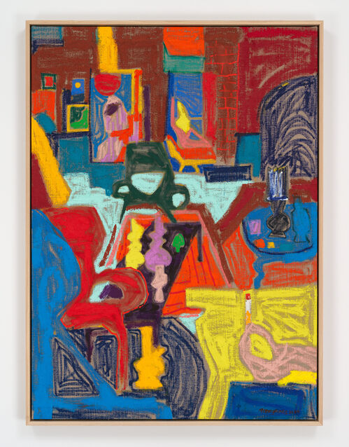 The exhibition features richly saturated scenes of quiet interiors made with oil sticks and oil paint. These works are populated with familiar iconography for the artist, such as cats, teapots, chairs, and windows. Friends and Family (2024), for instance, is bathed in reds, greens, and blues, illustrating an empty, colorful house, a touching reflection on solitude and familiarity.
