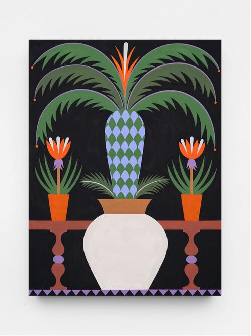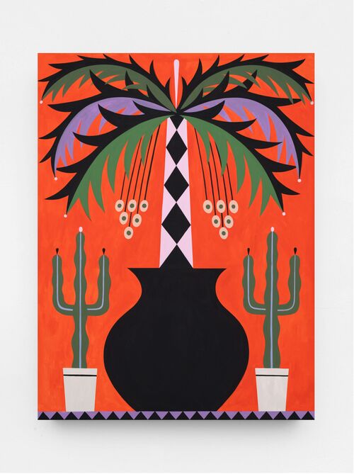 Italian painter Agostino Iacurci is fascinated by the cyclorama, a 19th-century form of visual entertainment designed to immerse viewers in vast, panoramic scenes shown in circular spaces. Following its debut at the Pacific Design Center in West Hollywood in 2023, his latest exhibition adapts the artist’s graphic, blocky style to the walls of Robert Grunenberg’s more traditional gallery architecture. Central to the exhibition are motifs of the palm tree and cactus, which are shown in a flat, geometric style with crisp tones and satisfying symmetry, a stylistic twist on the chaotic immersion of the cyclorama. The same tall palm trees, in simple monochrome-like shadows, are also painted onto the gallery’s walls.