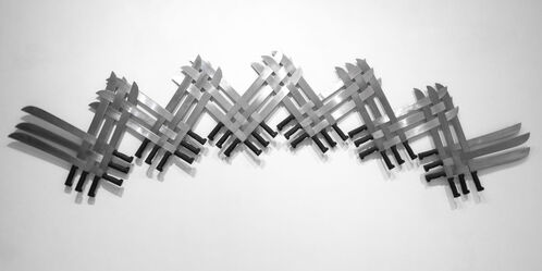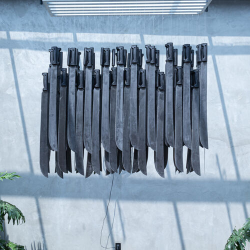 In the courtyard of Galería Ana Tejeda, 120 machetes hang suspended in the air. This violent rendition of a windchime—a sound sculpture titled Instrumento 2 (2024)—is the cornerstone of Miguel Rodríguez Sepúlveda’s solo exhibition “Do machetes dream?” Including work from 2011 to the present, this exhibition recasts the image of the machete, typically associated with agriculture or war, by creating intricate “crests,” as he calls them, with the blades.