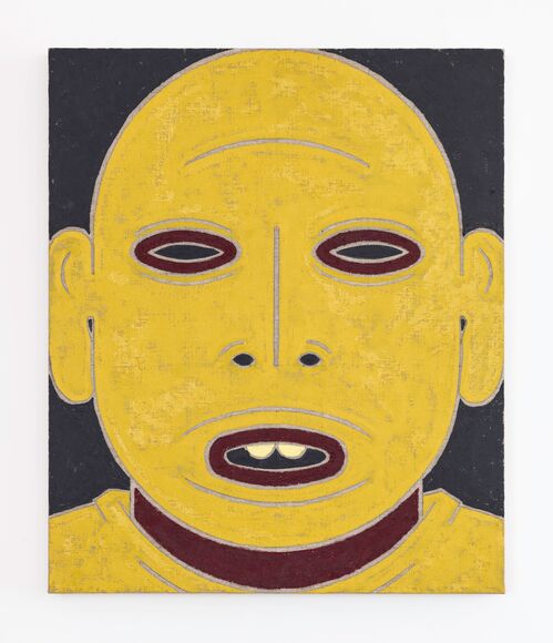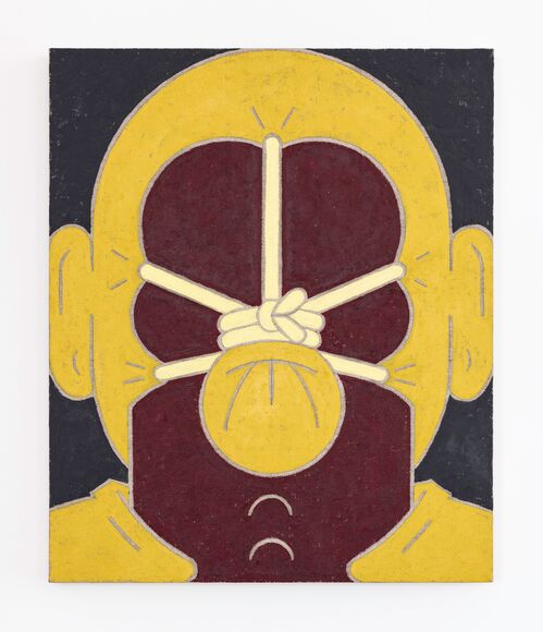 Gamboa’s PIEL/XIPETOTEC A (all works 2024), the first segment of a triptych, reinterprets the god of spring with a blank expression and slits for eyes. Traditionally depicted wearing the skin of human victims, the god appears in subsequent panels, PIEL/XIPETOTEC B and PIEL/XIPETOTEC C, with visible bindings holding together his gruesome garment. Gamboa achieves a fleshy quality through the use of swaths of golden-yellow oil stick on linen, linking his form to his subject.