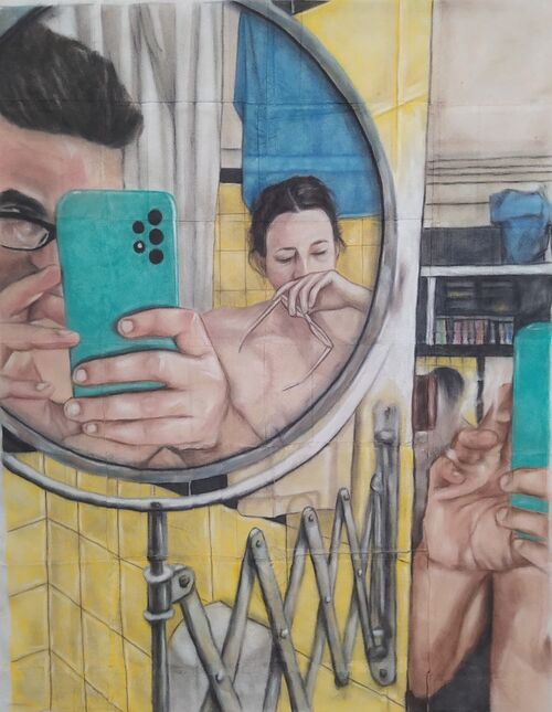 Such moments are captured in splashy color by French artist Anne-Sophie Tschiegg, whose portraits of entwined couples bear the influence of Fauvism, and Emily Wise, whose subjects are pulled together in a pink and purple vortex. In Immersion in the World (2024), Diana Ruban renders an embracing femme couple in vivid cerulean. Elsewhere, contributions from Gabriela Reyna’s “Series El Baño” use the unconventional materials of makeup and makeup wipes to capture the intimacy of shared daily grooming rituals.