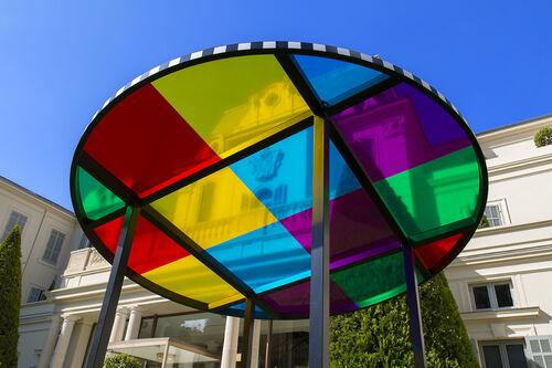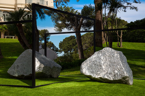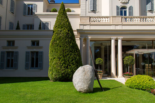 This summer, the hotel’s grounds will be transformed into a sculpture garden curated by Parisian gallery owner Kamel Mennour, who has been invited to present a group of monumental works by five contemporary artists. Works by Daniel Buren, Alicja Kwade, Bertrand Lavier, Lee Ufan, and Ugo Rondinone enliven the park with their playful use of materials, colors, and forms. Kwade’s Big Be-Hide (2022), for example, sets a granite stone and its aluminum replica on either side of a two-sided mirror in a poetic game of hide-and-seek.