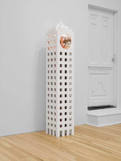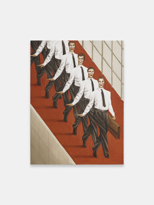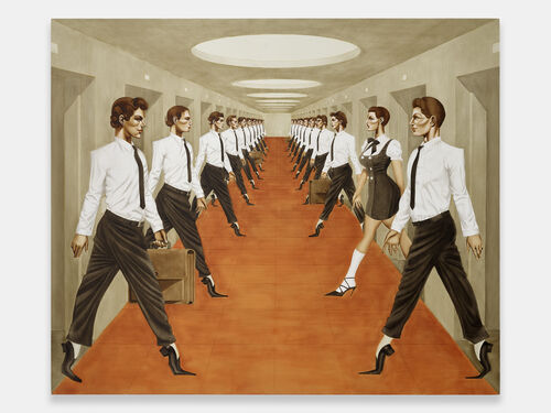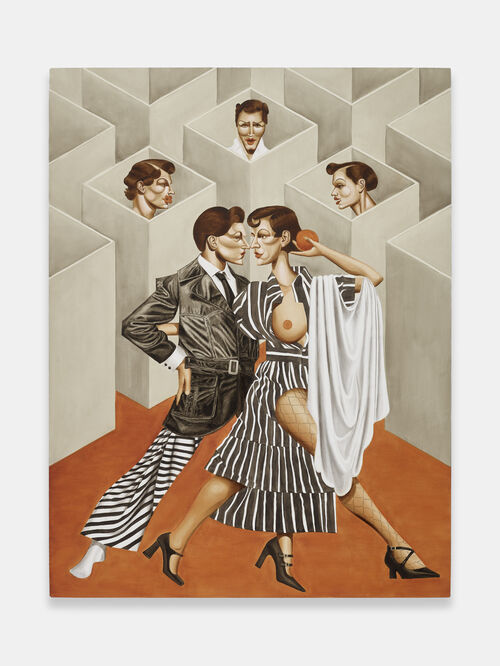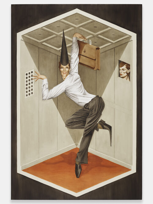 “Playtime” includes a diorama of a skyscraper (a nod to the artist’s architectural training) filled with workers at their desks dressed in their corporate attire. Inside, the walls are mirrored, so the viewer sees glimpses of themself peering back, adding a sense of voyeurism. This act of peering occurs again in the paintings Gentle Reminder (all works 2024) and One-to-One, in which tiny heads peek through small squares, watching unsuspecting figures caught in frenetic poses. It’s unclear where these peeping figures are located. In One-to-One, the voyeur looks into an elevator suspended in darkness, leaving the viewer to imagine the remainder of the building. In Gentle Reminder, space is further distorted and the figure watching the main subject resembles a floating head at the end of a long corridor.