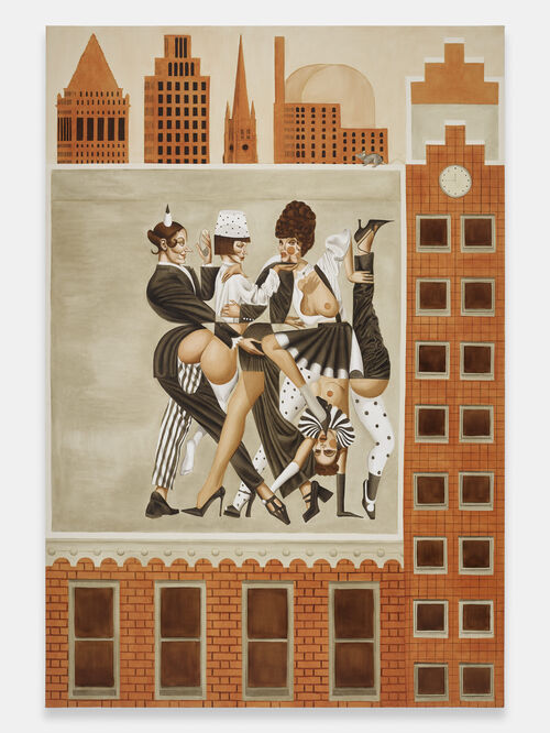 Villafañe has made this corporate setting the subject of his latest body of work, on view in “Playtime” at Charles Moffett in New York through August 2nd. Comprising paintings, drawings, and a diorama, “Playtime” was inspired by the artist’s “unexpected viewpoint as an ‘outsider’ into the intricacies of technocratic environments…and explores the theme of power, both real and illusory,” he explained. In each work, figures dressed in corporate clothes (all in tones of black and white, including several in matching white dress shirts with black ties, pants, and shoes) engage in their daily routines—clocking in, riding the elevator, attending meetings—in spartan, grid-like offices and seemingly endless corridors with gray concrete walls and burnt-red carpeting. Their clothes and their activities, however, devolve into salacious chaos, as figures abandon their well-rehearsed performances and professional façades for lascivious expressions and glimpses of butts and breasts that burst through open shirts and dresses.
