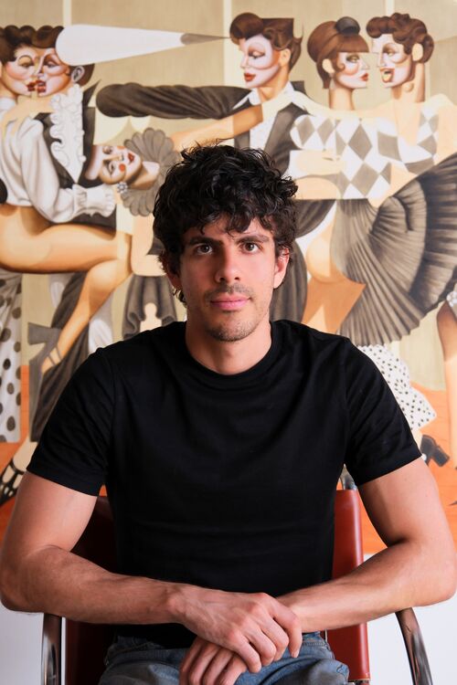 Despite the focus on the workplace, the works on view are sensual and carnivalesque. The figures are angular, geometric, and tightly structured, as if choreographed. “Fashion, much like architecture, plays a critical role in shaping identity and creating performative narratives,” the artist said. In some works, subjects’ corporate attire is adorned with patterns, and dramatized, campy makeup verges on drag with faces that mirror the arches, columns, and distinct shadows of the buildings. “By accentuating angularity and structure, the faces appear closer to masks, behind which identities cannot be revealed and true origins are concealed,” Villafañe said.