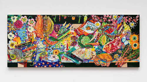 Like kaleidoscopic atlases, her compositions index the sociopolitical landscape in contemporary L.A. through the edible delights it produces and serves. To convey her critical engagement with both the economic and ecological impact of food, she depicts California’s superabundance of produce (think spring onions, nectarines, and melons) alongside books like Michael Pollen’s In Defense of Food and Joyce Goldstein’s Inside the California Food Revolution.
