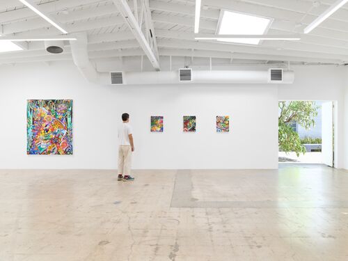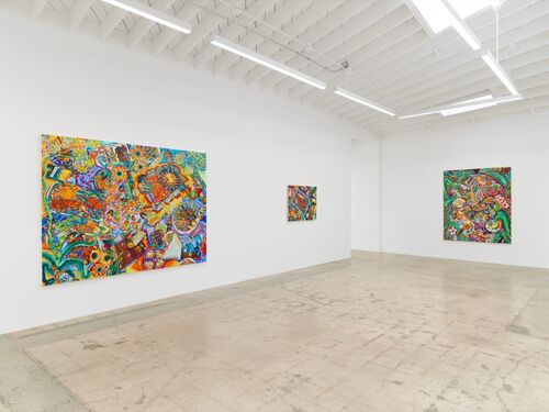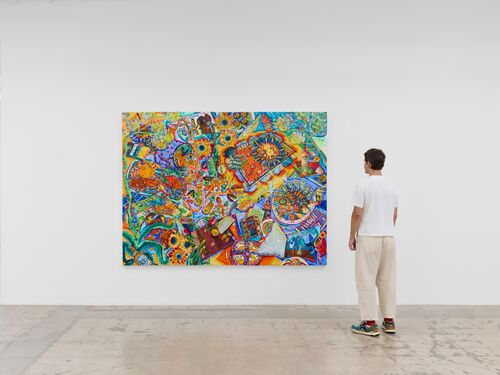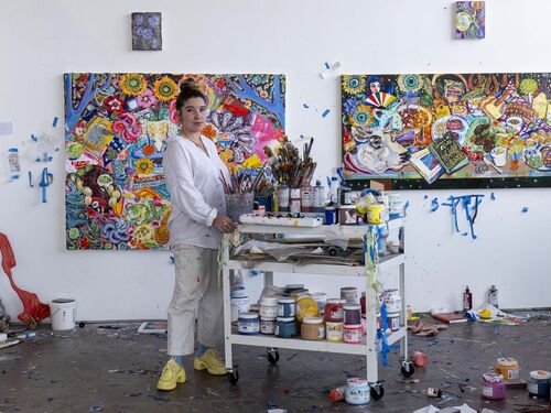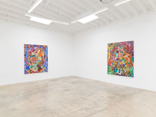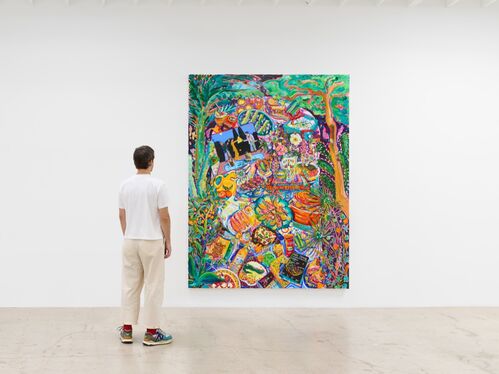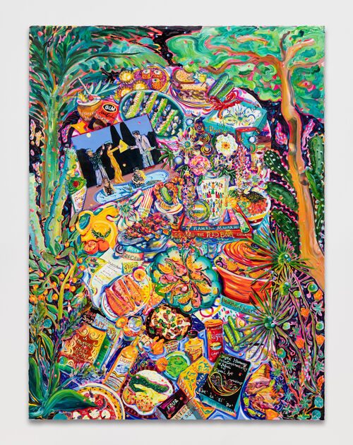 The largest painting in the exhibition, The Real McCoy (2024)—also her largest to date, at 96 by 72 inches—is, perhaps, the most personal. The colorful, fantastical banquet is inspired by the two halves of her ancestral lineage (maternal and paternal). Though both families were visual storytellers, connoisseurs, and California migrants, in every other respect, they were diametrically opposed: her mother’s relatives immersed in Hollywood’s glitz and glamour, her father’s with the bohemian art scene around Charles and Ray Eames.