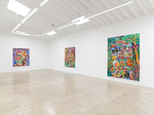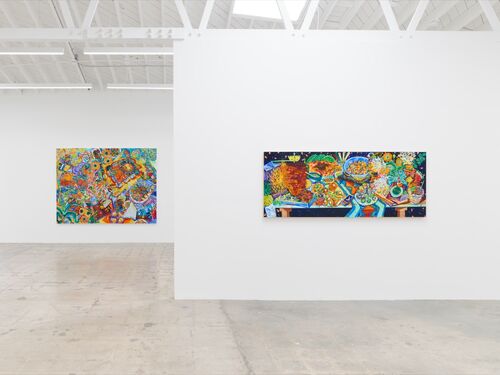 For Ernest Hemingway, a “moveable feast” referred to a formative experience of a place—in his case, Paris—that stayed with you long after you’ve left. For self-described artist-anthropologist Kate Pincus-Whitney, the enduring experiences that inform her paintings are literal feasts, too, centered around shared meals in her hometown of Los Angeles. Stuffed celery from Musso & Frank Grill, Nancy Silverton’s Caesar salad, French dip sandwiches from Philippe’s, and Roy Choi’s Kogi tacos from his first food truck in Venice are just a few of the dishes on the menu at Pincus-Whitney’s sumptuous L.A. debut at Anat Ebgi, on view through August 17th.