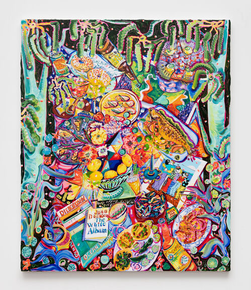 Other works offer topographies of various L.A. neighborhoods’ robust culinary scenes. For example, Round and Round In The Circle Games (2024) explores the past and present of the city’s West Side, where the artist was born and currently resides after an extended stint in New York and Rhode Island. The crowded table features dishes from storied establishments and newcomers alike, including royal fried rice from Rutt’s Hawaiian Cafe and oysters on the half shell from Dudley’s Market. Alongside the iconic plates are painted reproductions of works by artists that defined the local imaginary and cultural mythology: books by Joan Didion, Joni Mitchell records, and a David Hockney painting of the Pacific Coast Highway.