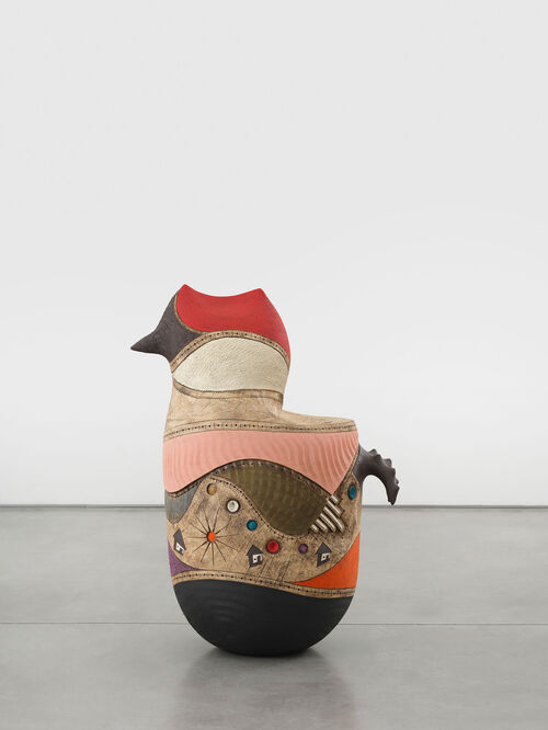Today, these formative childhood experiences provide the seed for his first solo exhibition at David Kordansky Gallery in Los Angeles, a major moment of recognition for the artist. One standout work in “INTLOMBE”—on view until August 24th—depicts a chicken, a nod to the small animals he saw as a youth, but realized on a dramatically larger scale. ISIKHUKHUKAZI (2024) is among 12 ceramic sculptures organized in a circle at the gallery. The name and format of the show are inspired by the musical gatherings of Xhosa-speaking peoples and reflect the communal and spiritual aspects of Mbunyuza’s South African heritage through the medium that first captured his imagination: clay.