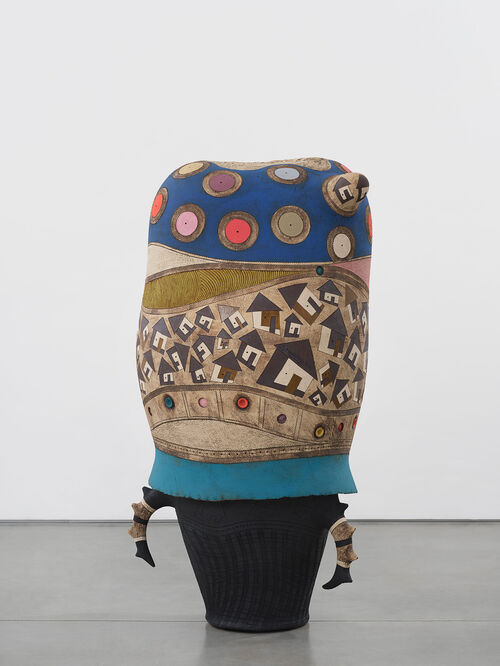 Meanwhile, YEMYEM (2023), a totemic piece resembling a headless female form, is adorned with ceremonial-looking attire. Zig-zagging and curved lines segment the headless body, while above the hips, a series of tassel-like appendages lay on ribbon-shaped designs, evoking the elegance of traditional Xhosa dress.