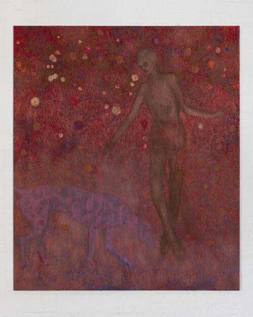 This new body of work builds on the historically inspired, mystical scenes for which Bak is becoming known. In it, he explores the intersection of beauty and violence, taking cues from Lawrence Alma-Tadema’s The Roses of Heliogabalus (1888), in which the Roman emperor Elagabalus smothers his guests under a cascade of rose petals. Bak produces these paintings through a meticulous process of working and reworking thick layers of wax and paint across months to years.