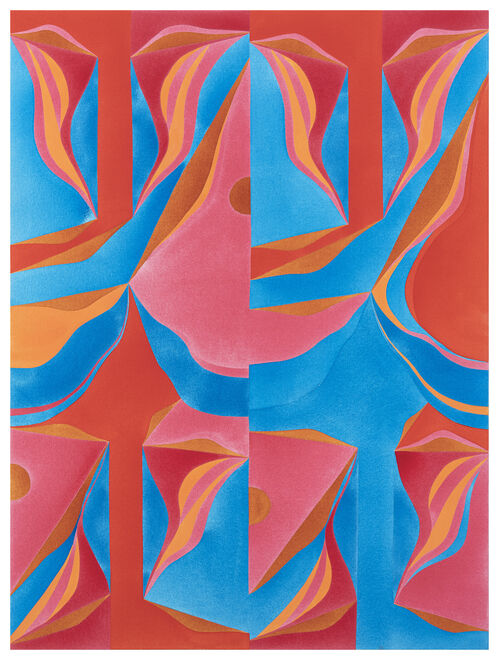 The tessellated works featured in White Cube’s presentation all take inspiration from the Roman mosaics found at the Baths of Caracalla. Odgen’s three-year-long fascination with this subject began during her time as an Abbey Fellow at the British School in Rome in 2021, when she became interested in the continuity of forms across history. This interest is reflected in the artist’s practice, where repetition is a creative catalyst. Each successive piece subtly shifts while maintaining a connection to its predecessors.