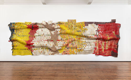 For his exhibition at Talbot Rice Gallery, part of Edinburgh University, Anatsui presents wall hangings, wooden reliefs, works on paper, and a monumental outdoor installation at the University of Edinburgh’s Old College Quad. The 25-meter-wide work TSIATSIA – Searching for Connection (2013) symbolizes the complex map of identities and cultural connections across post-colonial Africa. Another 13-meter-wide tapestry was inspired by the Scottish Mission Book Depot in Keta, which provided him with books and art materials as a child. Yellows and earthy red hues undulate over the surface of his works, reflecting the volcanic surroundings of Edinburgh.