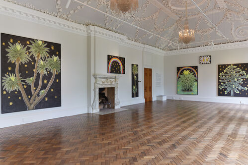 Characterized by almost pitch-black painted backdrops, Glasgow-born painter Andrew Sim’s works depict mythical creatures, rainbows, plants, and forests as signs and symbols to document Sim’s experience of queerness. The show brings together recent paintings, such as Portrait of a Yucca with Lots of Heads and Stars (2024). The canvas depicts a painting of a yucca, which is planted beside The Glory (a pub and LGBTQ+ venue in London’s East End). Many of their paintings associate particular objects with a certain space or place that has impacted Sim’s day-to-day experiences. Other paintings feature twin characters, or two objects together, which Sim explained in a recent interview is “essential” to queer art. “It’s just showing two things that are the same, together. It doesn’t necessarily mean romantic relationships, I think of it as queer family-building,” they said.