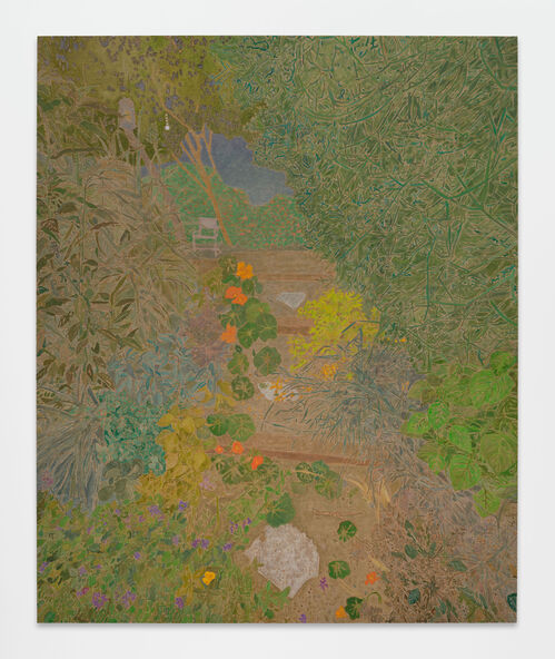 Rising Los Angeles–based painter Hayley Barker’s exhibition at Ingleby Gallery is all about celebrating the shifts in seasons. Luscious greens and earthy hues fill her canvases featuring her L.A. home and studio surroundings. Some works are cropped close-ups: a hawk, or a woven spider’s web. One round canvas depicts the autumn equinox moon, and other paintings play with perspective, leading the eye down a garden path or a bird’s-eye view of a flowerbed. As well as nature’s cycles, celebrations of the seasons feature in her work, such as My Folks’ Xmas Tree (2024), a large-scale portrait-oriented painting of a Christmas tree. Barker’s works respond to the play of light in the gallery, which is situated in the historic Glasite Meeting House, designed in the 1830s as a religious space.