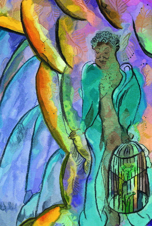 The Caged Bird’s Song triptych tapestry depicts a Trinidadian seascape with a waterfall backdrop, featuring Adam and Eve sitting together, and two figures framing the scene, one holding a caged bird. Translating watercolor paintings into tapestry is a challenging task for weavers, which often requires a spontaneous approach to capturing the fluidity and detail of the paint, which adds to the complexity of this piece.