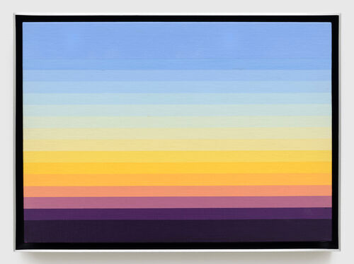 Other artists catalog the sky’s constant fluctuations. Several small sunsets, portrayed in geometric gradations by the late Light and Space painter Norman Zammit, appear in “A Particular Kind of Heaven.” Their stark lines evoke recent explorations elsewhere by Brooklyn-based artist Rob Pruitt. In works like A Month of Sunsets (November 2023) (2023), Pruitt captures the light show at the end of each day in dreamy, semi-abstract gradations, for a month straight—then lines them all up in the structure of that month’s calendar. Pruitt treats every sunset with the utmost attention to detail, portraying it like a fingerprint of that day.