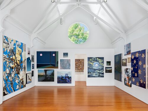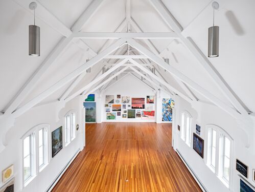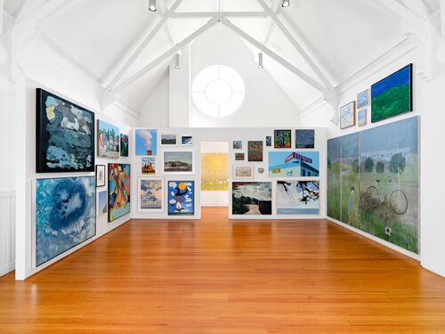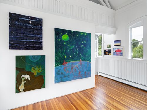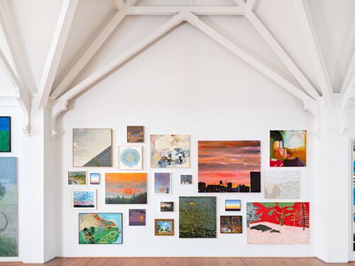 Revelers gathered at Ann Craven’s church in Thomaston, Maine, on July 21st to celebrate “A Particular Kind of Heaven,” an expansive group show organized by Karma. The sky outside was crisp and azure, with white, wispy clouds. Inside, though, over 100 unique stratospheres abounded, inspired by the changing moods of this celestial canvas.