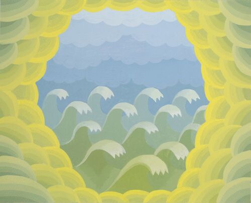 New York–based painter Amy Lincoln’s pastel meditations promote centeredness and mental health through repeating natural features like trees and waves, interspersed throughout sweeping vistas doused with banded gradients of harmonious hues. In an interview, Lincoln explained that although she’s not spiritual, painting “makes me feel happier, calmer, more connected to the world and less in my head.” Looking at her work creates the same effect. She paints idyllic and stormy weather alike, finding beauty in every temporary state.