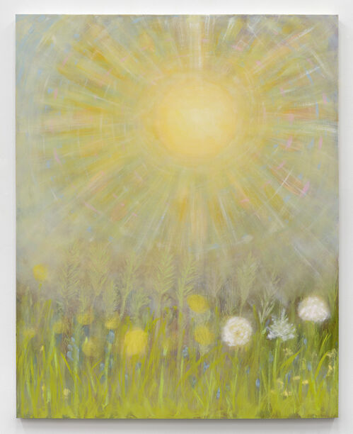 While airplane travel has diminished some of the sky’s unattainability over the past century, it seems no amount of rocket fuel can dissolve the sky’s portentous allure. Many contemporary artists are elaborating on the time-honored transcendental approach, beyond the scope of Karma’s show. For example, Montreal-based artist Joani Tremblay creates playful depictions of the sky in her charged, framed landscapes, partly imagined and partly based on reference images. Her latest paintings focus on mountainous horizon lines, but some, like Untitled (Rain) (2023), depict clouds alone. “Sky means vastness and vastness means room for questions,” Tremblay wrote over email, adding, “Like real life, the skies are usually the source of light in the paintings, the source of luminosity.”