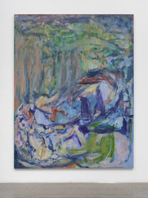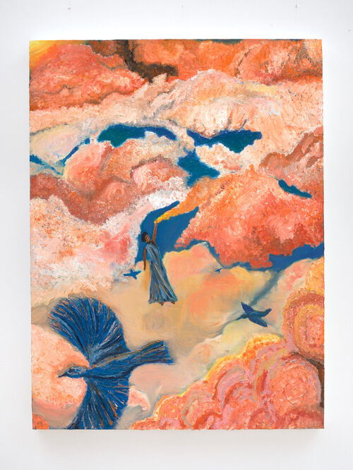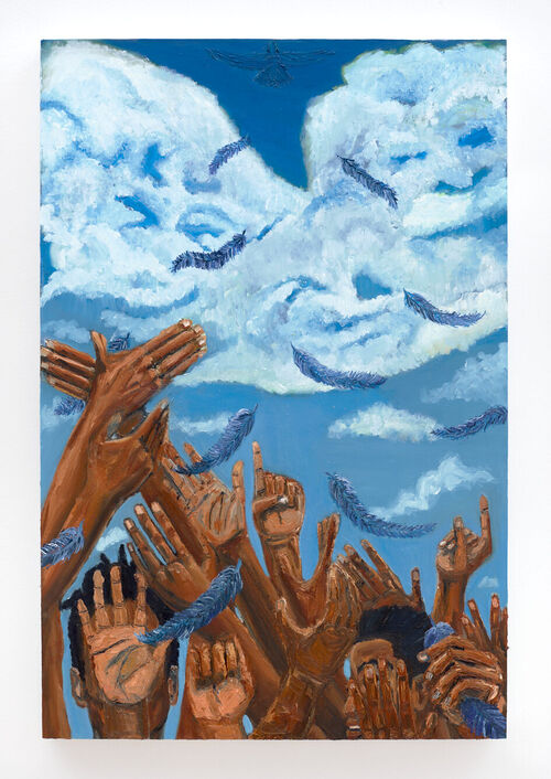 The skies in Key’s recent show “BlueBird” at 1969 Gallery were alive with spirits. A face in the sky peers through a window in Look Up To See (all works 2024). The clouds in I Am The Blue Bird coalesce into the loose shape of a skull. Elsewhere, the sky swirls and invigorates Key’s characters—the silhouette of a bird even emerges above Jump To Feel Their Arms, where Key has imprinted the creature in a slightly darker blue than the rest of the sky. “The sky almost protects this bird,” Key said during a walkthrough of the show. “It allows this bird to be incognito, to disappear.”