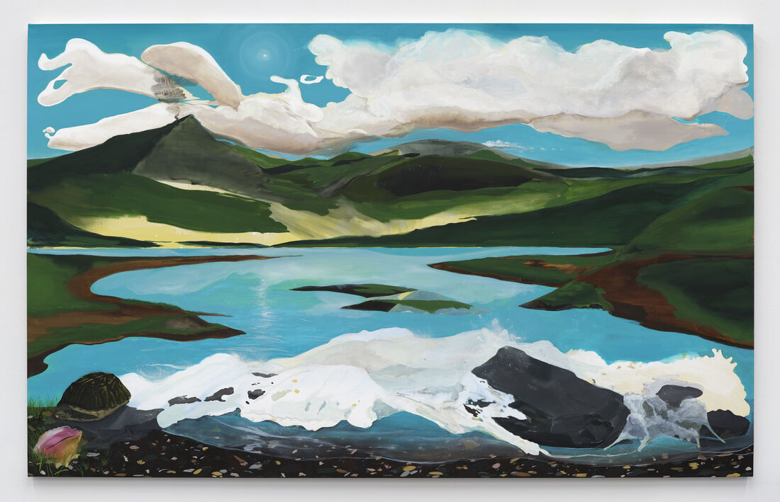 In the house of worship that serves as both Craven’s studio and an exhibition space, an expansive landscape by New York–based artist Nathaniel Oliver entitled Over Here (2024) beckons guests through the entrance. Oliver has built a meteoric career on narrative vignettes that infuse Black figuration with magical realism. Like Ruscha, Oliver often uses the sky as a compositional foundation. In some works, like Further Together (2022) and You Can Smell The Storm (2022), the sky swirls around figures like a character itself, in the form of weather. But Over Here is Oliver’s first painting without people. Its blue sky reflects in a lake, or perhaps a river, at the base of a majestic mountain. The sky is not far away here: It’s an active participant in life on earth.