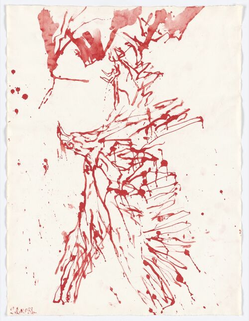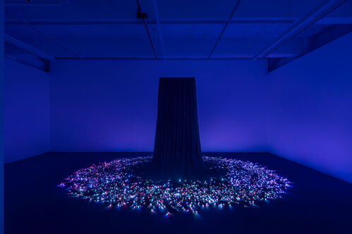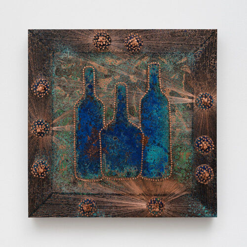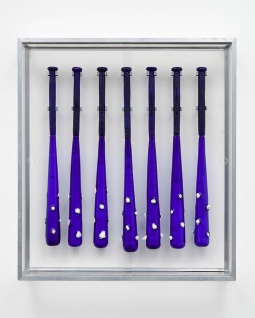 Known for his use of found objects collected in Harlem, Nari Ward transforms everyday materials into sculptures and installations with powerful sociopolitical narratives. In his current show at Lehmann Maupin, copper, with its healing connotations, becomes a canvas etched with depictions of liquor bottles and prayer candles, in several new works that nod to communal rituals of mourning and celebration. Other bodies of work explore the subject from different angles. In Medicine Bats (2011), reproduction glass baseball bats are presented in cabinets to symbolize the duality of protection and violence. Meanwhile, his new installation OHM (2024) uses found shoelaces to explore the connection between meditation (reflecting the traditional sound in the title), ritual, and resistance.