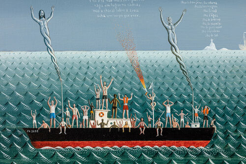 In the most recent work on view, the long, horizontal seascape Boat People (2024), Cerveny focuses on the migration of Vietnamese people following the Vietnam War. With its title and literary reference points (The Odyssey and Moby Dick) painted on a framing band at the top of the work, the sparsely illustrated scene draws fascinating links between the colonial history of seafaring and its mythological sources. Cyclops, for instance, is one of the monsters faced by Odysseus in Homer’s poem, but also the name of a ship lost at sea in 1918. It heads up a long list of historical shipwrecks that snakes down the center of the painting.