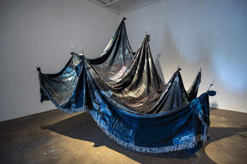 For this installation, the artist based their sculptures on the prized possessions of stock market investors who lent them objects that “they would take to their grave,” according to the artist’s description. Titled Burden (2024), it’s part of Leatherbury’s series “Insiders’ Grave,” and of their wider research into the meaning of value and ownership over time. The sculptures are randomly stacked, as if unintended for public view, and appear broken-down and dilapidated. Their copper layers seem to be peeling and discolored despite their temperature-controlled and sanitized environment, evoking the futility of capitalist structures on a decaying and warming planet.