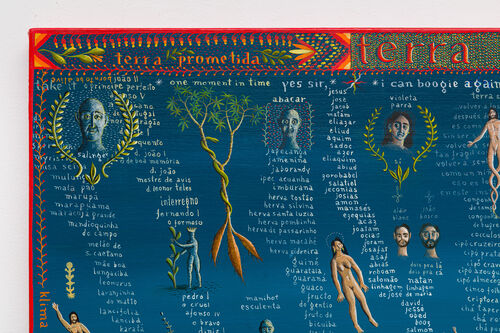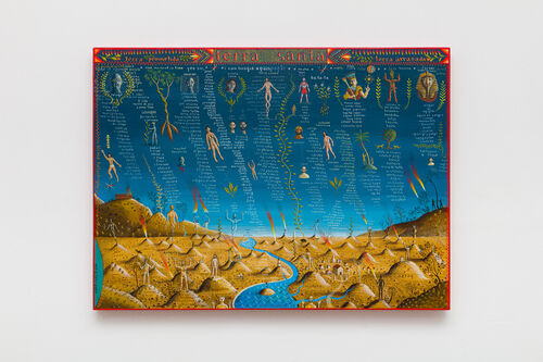 In one of the upper galleries in the main Biennale pavilion, Alex Cerveny’s paintings depict a kind of historically informed, encyclopedic panorama gesturing to themes of historical international migration. In Terra Santa (2023), a hilly desert landscape is annotated with illustrations of bodies, plants, and alphabetical lists of names and places, drawing links between seemingly disparate themes, like Biblical plagues of Egypt and pop songs (“Yes Sir I Can Boogie,” “One Moment in Time”).