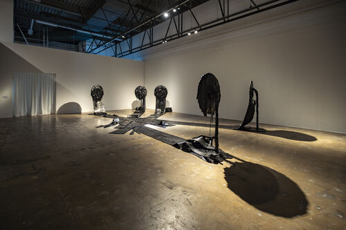 With the Gwangju Biennale’s focus on sound, it’s perhaps unsurprising that one of the standout artists would be a musician. Arutiunian is a composer as well as an artist, working with sonic dissent and personal histories of sound. In the main pavilion, his visually arresting work Below (2024) consists of five bitumen sculptures. These haunting, black gloop–covered discs atop speaker-height stands emit a low, rumbling audio that tugs at the edge of the viewer’s awareness. This sound is supposed to evoke the progress of the material as it bubbles up through the earth’s crust.