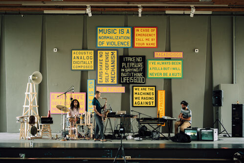 The Gwangju Biennale’s national pavilions—though similar in theory to the state-organized pavilions of Venice—are, in fact, put together by outside sources and only loosely affiliated with their respective countries. Indonesia’s national pavilion has been organized by artist Julian Abraham, a.k.a. Togar, and consists of a casual, welcoming space in the Asia Culture Center. It’s filled with beanbags for jam sessions, an immersive work of cardboard boxes, and the artist’s own idiomatic signs, printed in bright neons. “You may say I’m a drummer, but I’m not the only one,” reads one, riffing on the famous John Lennon lyric in Ed Ruscha–esque capitals.