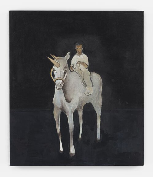 “The focus that he had was very much on Black persons as protagonists from their own perspective, from a real, everyday life, but with all of the potential and possibilities that this carries,” Paola Malavassi, the curator of the show at Das Minsk and co-initiator of the exhibition, told me. Curated chronologically, the show opens with an early work, 40 Acres and a Unicorn (2007), which underscores this statement: a Black man sits atop what at first glance appears to be a normal steed, his left hand fixed upon the horn of the saddle. The background is entirely black, the horse and its rider coming from and going into an abyss. Soon enough, though, the massive horn establishes itself as the center of the image, with the title referencing an 1865 military decree promising formerly enslaved families “40 acres and a mule.” When the Civil War ended, the land reserved for this purpose was returned to white owners. Today, the phrase symbolizes broken promises and reparations for Black Americans that never came. With a unicorn replacing the mule in a landscape ripe for projections, Davis seems to propose a magical ride rooted in reality but leading into a hopeful future.