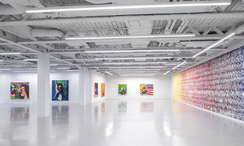 Two years later, Slawn, now 23, is opening his debut solo exhibition at Saatchi Yates, “Olaolu Slawn: 1,000 Canvases.” Running until October 20th, the show features 1,000 brightly painted A4-sized works, each featuring a spray-painted face and priced at £1,000 ($1,300). Meanwhile, the artist’s new body of larger works is rife with provocative imagery—from caricatures of KKK gatherings in OKKK (all works 2024) to a Simpsons-esque female figure set against the American flag in American Ice. The show makes it clear that he isn’t interested in playing by the rules, through the irreverence of both his work and his persona. At the buzzy opening, where the large crowd of gallerygoers spilled onto the street, he even stepped outside to paint a parked car.